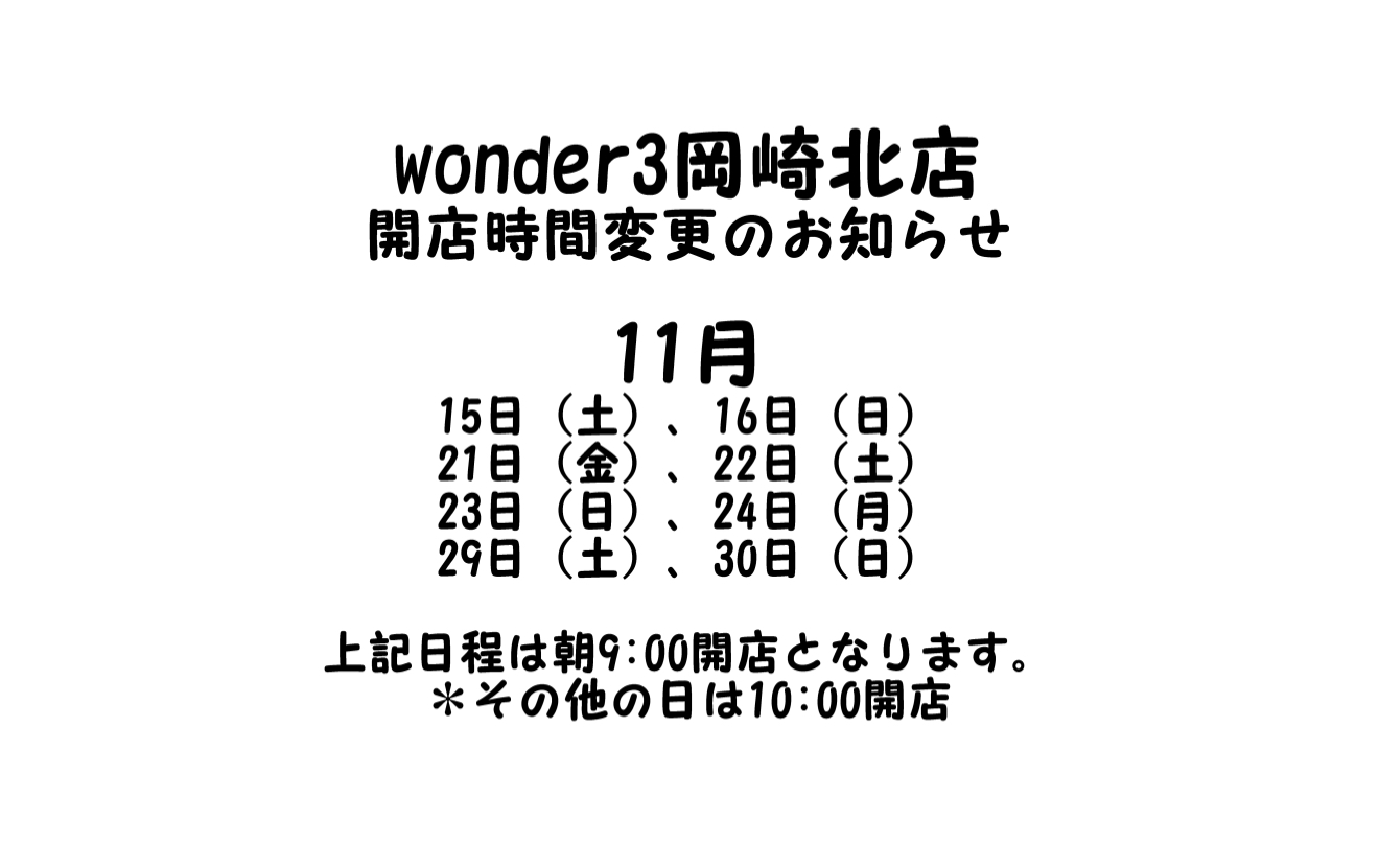 ワンダースリー岡崎北店より営業時間変更のお知らせです。