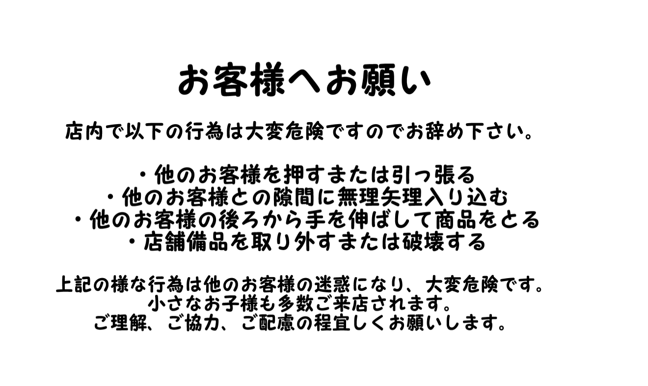 ・他のお客様を押すまたは引っ張る ・他のお客様との隙間に無理矢理入り込む ・前のお客様の後ろから手を伸ばして商品をとる ・店舗備品を取り外すまたは破壊する